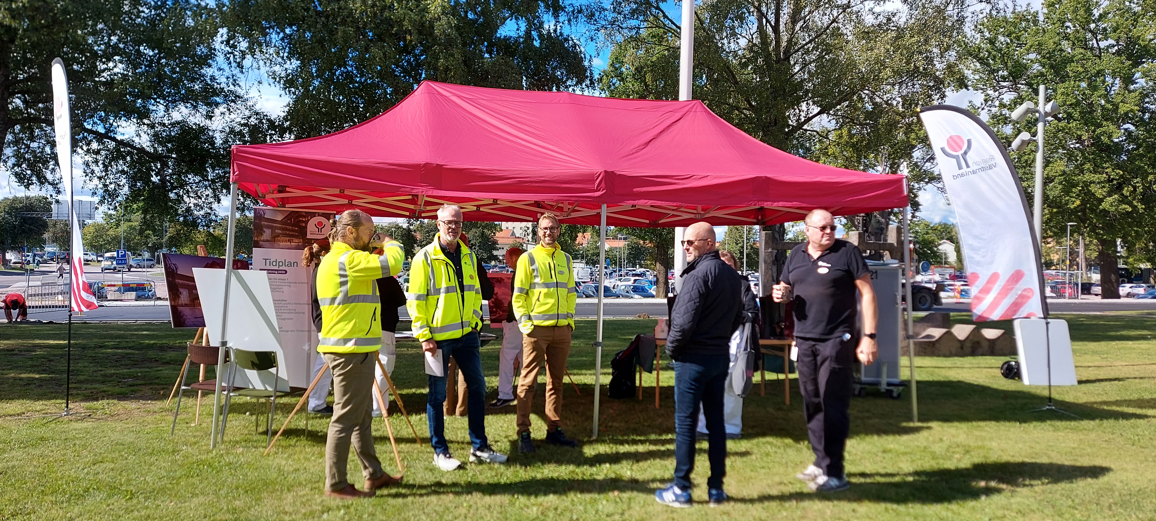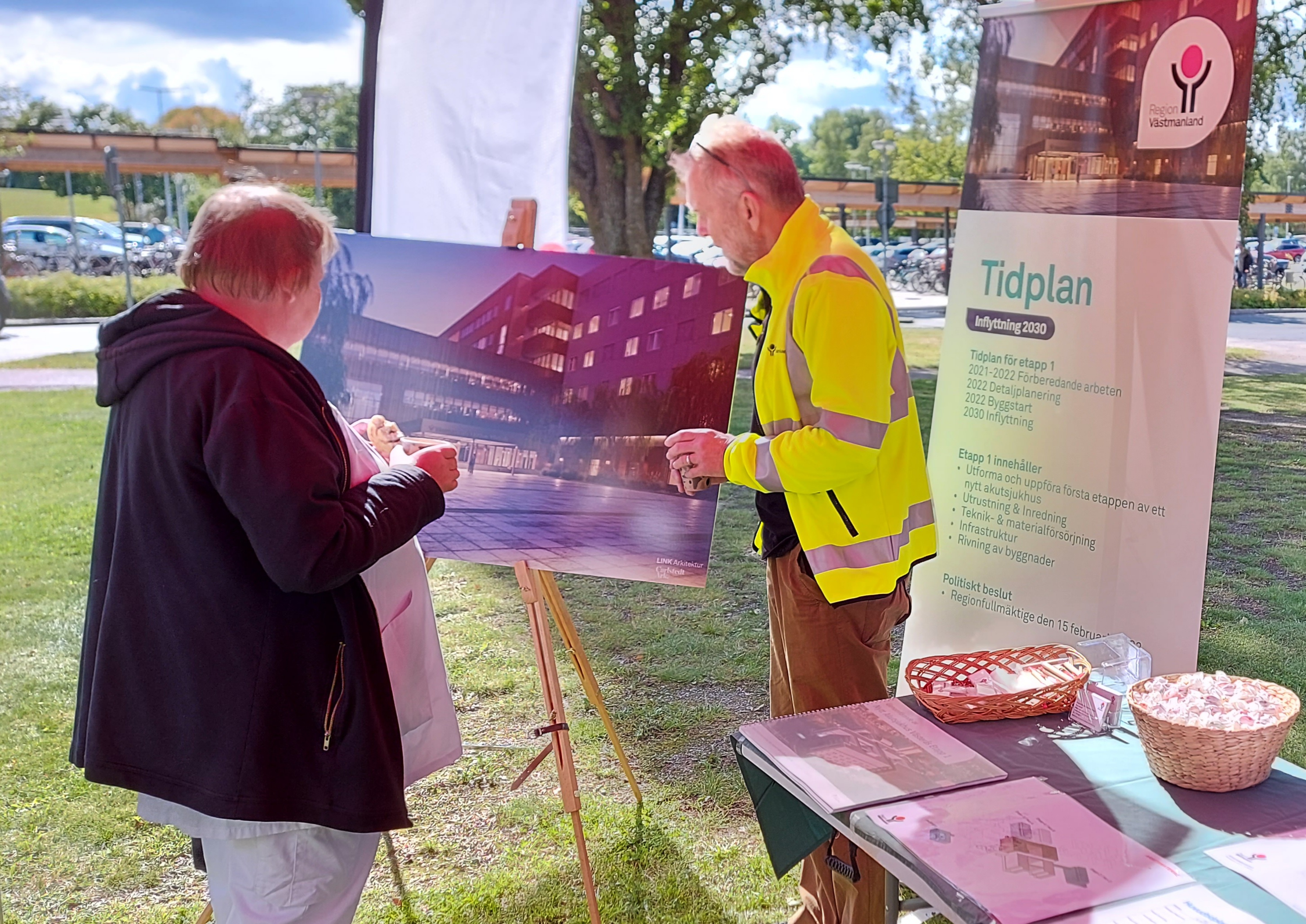 Framför huvudentrén berättade vi om pågående arbeten och om de nya vårdbyggnaderna.
