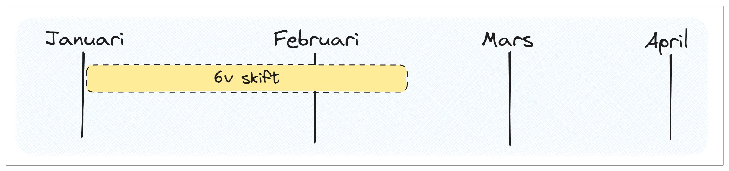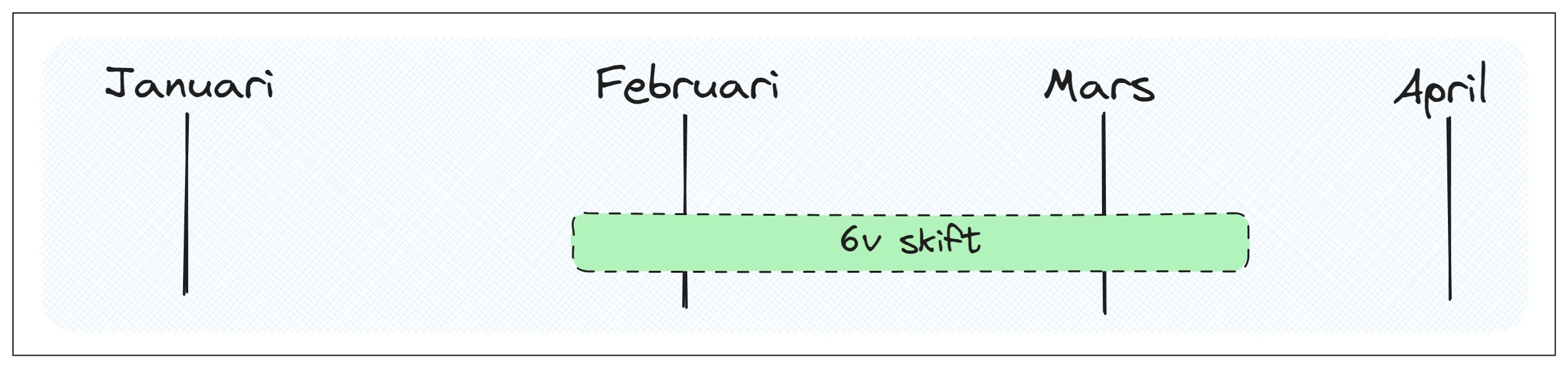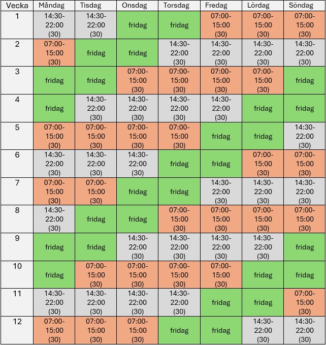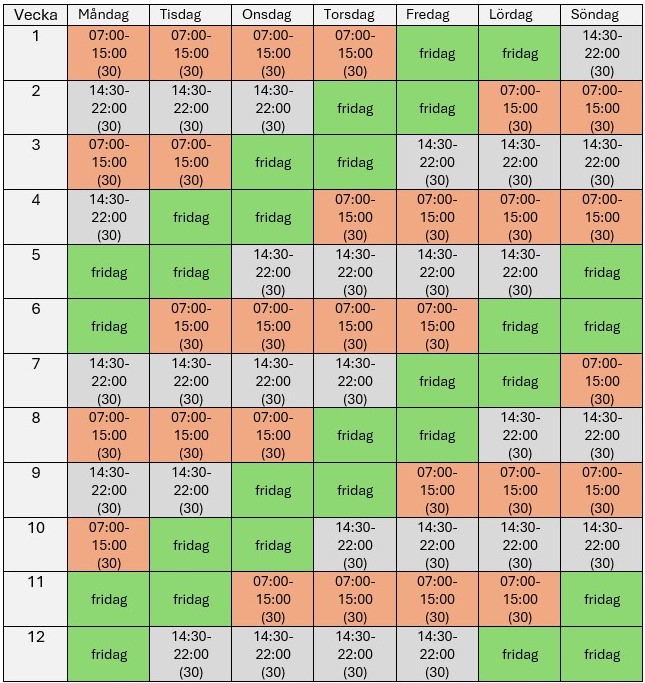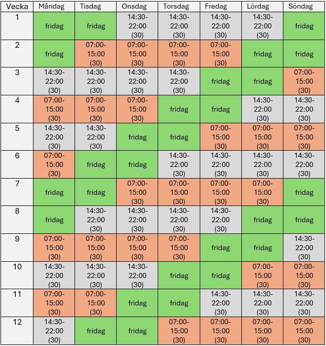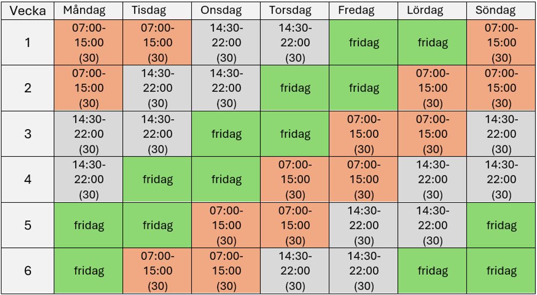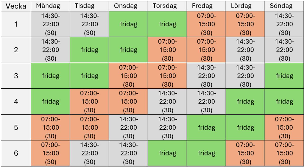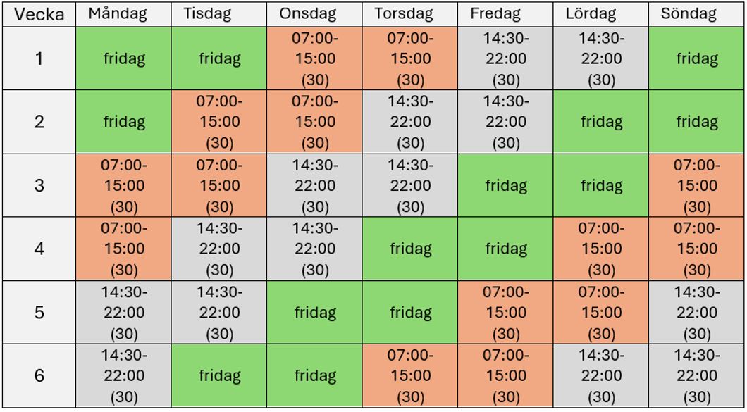 Skifttjänstgöringen innebär att du jobbar fyra dagar och är ledig två, enligt mallschema, där man växlar mellan dag- och kvällspass (ej natt). Arbetstiden uppgår till i genomsnitt 33:50 timmar/minuter per vecka, men hanteras som en heltidsanställning. Du kan teckna sig 6, 12, 18 eller 24 veckor skifttjänst om det tillämpas på din arbetsplats.