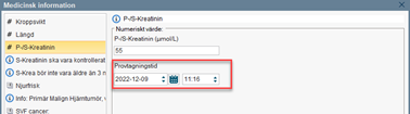 När ett kreatininvärde skrivs in manuellt blir Provtagningstid automatiskt dagens datum och aktuellt klockslag. Detta måste justeras om provtagningstiden inte är aktuellt datum. Tänk dock på att värdet inte bör vara äldre än 3 månader